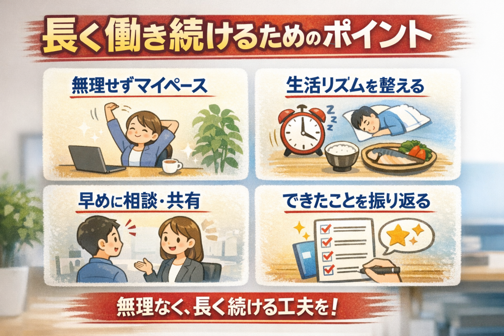 長く働き続けるためには、「無理をしない働き方」を意識しておくことが大切です。仕事に慣れてくると、つい頑張りすぎてしまうことがありますが、その状態が続くと体調を崩しやすくなります。最初から飛ばしすぎず、自分のペースを守ることが結果的に長く続けることにつながります。体調や疲れのサインに気づいたときは、無理をせず休むことも必要です。日々の生活リズムを整え、睡眠や食事を安定させることも、働き続けるうえで大事なポイントになります。