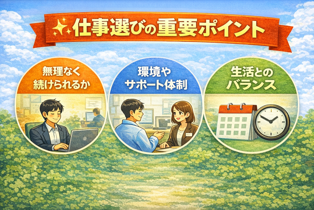 仕事を選ぶときは、あれこれ考えすぎると迷いやすくなります。そこで、まずは「無理なく続けられるか」「環境やサポート体制」「生活とのバランス」の3つに絞って考えてみると整理しやすくなります。